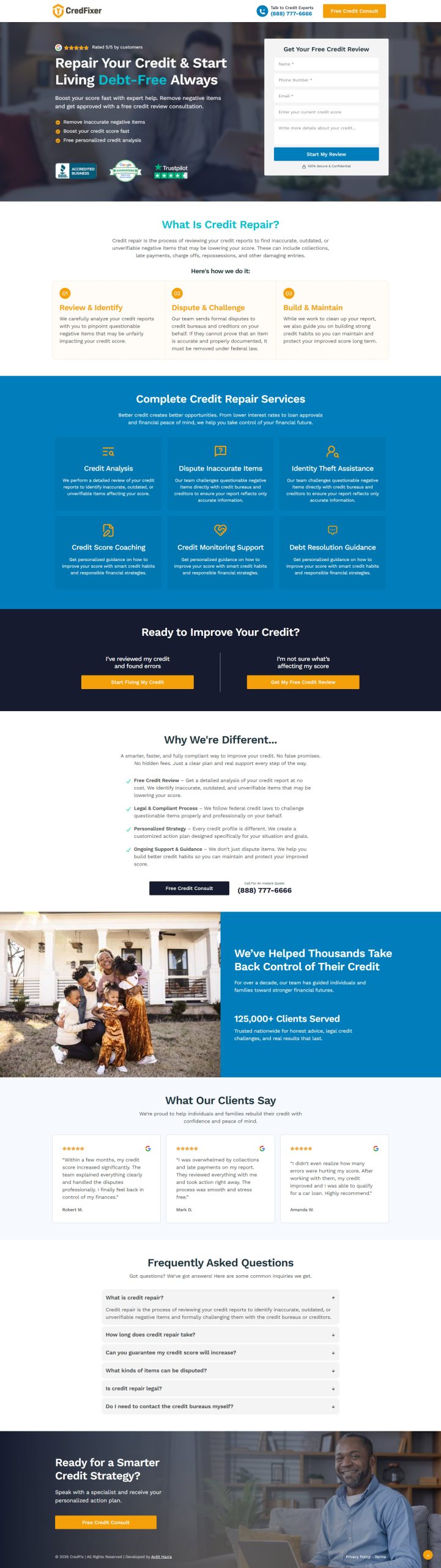 Built with WordPress and fully compatible with Elementor, CredFixer allows you to customize colors, text, images, and sections easily without touching code.